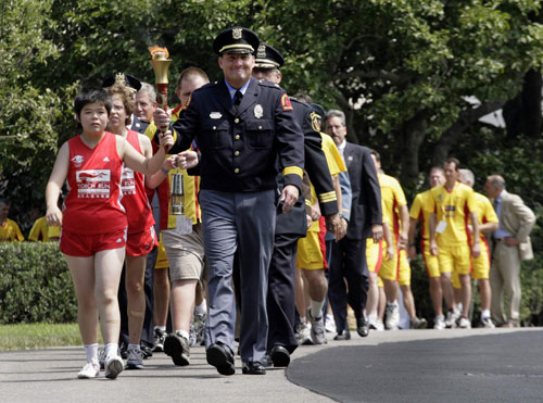 Law enforcement officers walk with Oiao Meili of China (L) and other Special Olympics athletes, bearing a Special Olympics torch on the South Lawn of the White House in Washington July 26, 2007 following a global law enforcement run ceremony in the Rose Garden. [Reuters]
