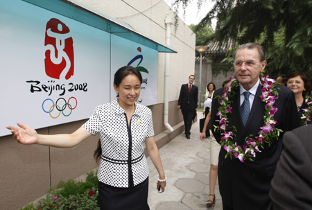 International Olympic Committee (IOC) President Jacques Rogge (R) visits Beijing No.4 high school, one of 200 "Beijing 2008 Olympic Education Model Schools", in Beijing August 6, 2007. The Chinese capital is gearing up to celebrate the one-year countdown to the opening ceremony of the 2008 Olympic Games on August 8. [Reuters]