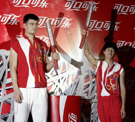 China's NBA super star Yao Ming (left) and Olympic 110m hurdles champion Liu Xiang attend the launching ceremony of the plan for one-year countdown to Beijing Olympics celebration in Beijing August 8, 2007. [Xinhua]