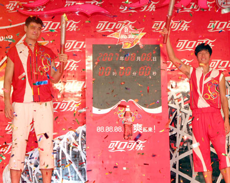 China's NBA super star Yao Ming (left) and Olympic 110m hurdles champion Liu Xiang attend the launching ceremony of the plan for one-year countdown to Beijing Olympics celebration in Beijing August 8, 2007. [Xinhua]