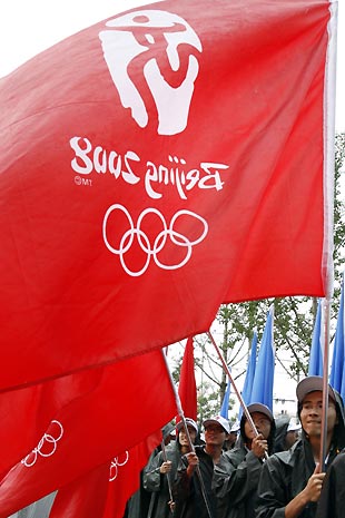 Volunteers parade with the 2008 Olympic flag during an event called "We'll Start with a Smile for 2008" in Beijing August 7, 2007. [Reuters]
