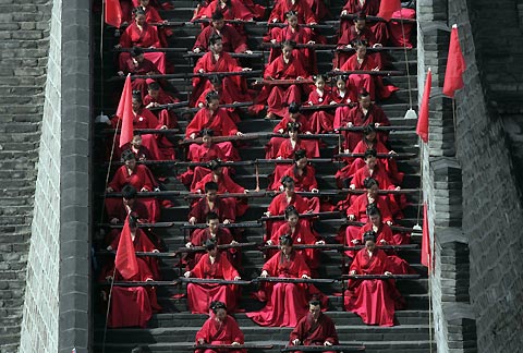 Folk musicians play the Guqin, a traditional musical instrument, at the Juyongguan section of the Great Wall on the outskirts of Beijing August 8, 2007 to celebrate the one-year countdown of the 2008 Olympics. The Games begin on August 8, 2008. [Reuters]