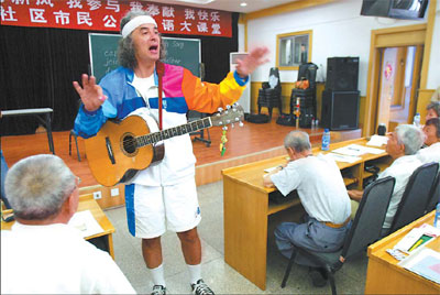 George Sapounidis, a Greek Canadian singer and Athens Olympics torchbearer, teaches an Olympic tune to retired residents in the Dongsi community.