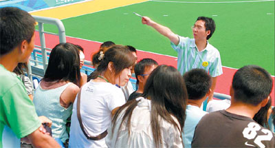 Olympic volunteers from Beijing International Studies University attend a training session at the Olympic Green Hockey Field.