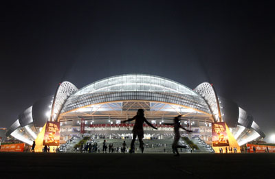 Children play in front of the Shenyang Olympic Sports Center Stadium, one of the five football venues of the 2008 Beijing Olympic Games, in Shenyang, capital of northeast China's Liaoning province August 5, 2007. Picture taken August 5, 2007. [Reuters]