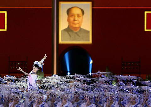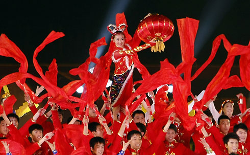Performers dance in Beijing, during a ceremony to mark the one-year countdown to the Beijing Olympic Games August 8, 2007. [Reuters]
