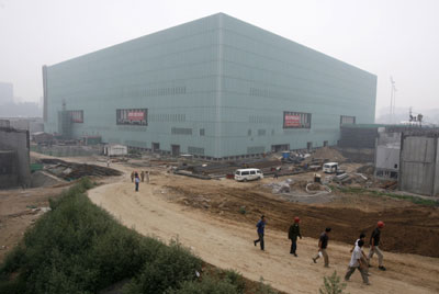 Workers walk outside the Wukesong Indoor Stadium, the venue for basketball during the 2008 Olympic Games, in Beijing August 6, 2007.[Reuters]