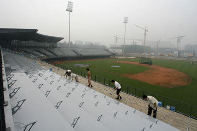 Workers paint the stand of Wukesong Baseball Field, the venue for baseball during the 2008 Olympic Games, in Beijing August 6, 2007. [Reuters]