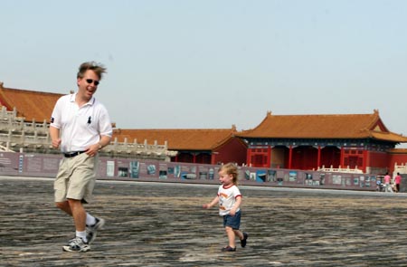 The father and hisdaughter fromAmerica family named "USA1776" play in Forbidden City in Beijing August 8,2007.Ten families, five from China, and five from overseas, have won a 12-day tour of China from an "Olympic Families Tour Beijing" campain, organized by Beijing Olympic Committe (BOCOG), on the occasion of the one-year countdown to the Beijing 2008 Olympic Games.