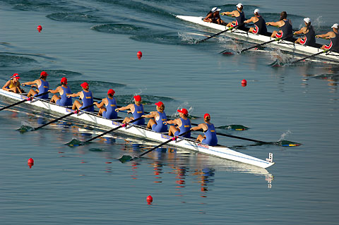 Rowers race during the World Rowing Junior Championships at Shunyi Rowing and Canoeing Park in Beijing August 10, 2007. The venue is also where the 2008 Beijing Olympic Games rowing competitions will be held. Athletes and officials at this week's championships, the first trial of 26 Olympic test events taking place this year, were unanimous in their praise for the rowing lake built to the northeast of the Chinese capital. [Reuters]