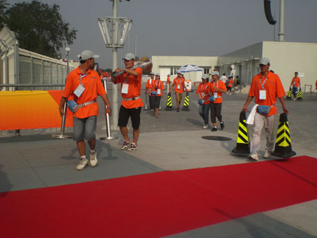 Volunteers collect equipment after the 2007 UCI BMX Supercross World Cup, one of the test events for the 2008 Olympic Games at Laoshan Bicycle Moto Cross (BMX) Venue in Beijing August 21, 2007. [chinadaily.com.cn]