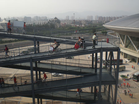 Riders leave the venue after the 2007 UCI BMX Supercross World Cup, one of the test events for the 2008 Olympic Games at Laoshan Bicycle Moto Cross (BMX) Venue in Beijing August 21, 2007. [chinadaily.com.cn]