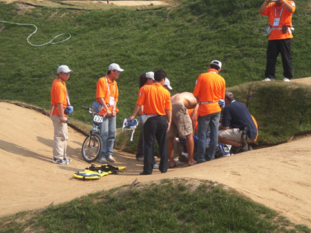 Volunteers and fellow riders examine a rider who fell down during men's semi-final game of the 2007 UCI BMX Supercross World Cup, one of the test events for the 2008 Olympic Games at Laoshan Bicycle Moto Cross (BMX) Venue in Beijing August 21, 2007. Donny Robinson from the United States won the final game 36.949 seconds. [chinadaily.com.cn]