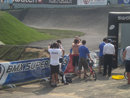 Riders help each other put off suits after men's semi-final game of the 2007 UCI BMX Supercross World Cup, one of the test events for the 2008 Olympic Games at Laoshan Bicycle Moto Cross (BMX) Venue in Beijing August 21, 2007. Donny Robinson from the United States won the final game 36.949 seconds. [chinadaily.com.cn]