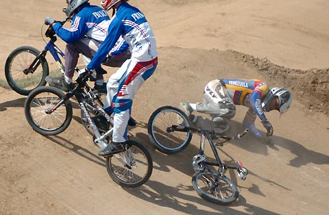 A competitor falls during the UCI BMX Supercross World Cup at Laoshan Bicycle Moto Cross (BMX) venue in Beijing August 21, 2007. A total of 26 test events will take place this year at the various venues where next year's Beijing Olympic Games will be held. [Xinhua]