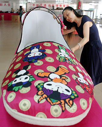 A huge hand-made shoe sits on display at a factory in Central China's Hubei Province on August 27, 2007. The shoe, with the five Beijing Olympic mascots on the vamp, measures two meters long. [Xinhua]
