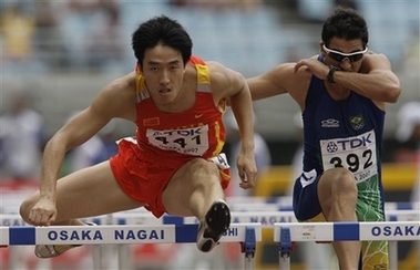 China's Liu Xiang, left, and Brazil's Anselmo da Silva compete in the Men's 110m Hurdles heats at the World Athletics Championships Wednesday, Aug. 29, 2007 in Osaka, Japan. [AP] |