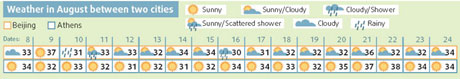 Between August 8 and 24 this year, the same period of the 2008 Olympics, the average day-time temperature was between 32 and 35 degrees Celsius, (89 to 95 Fahrenheit), or two to five degrees higher than previous years. The peak temperature of 37.3 degrees Celsius (99 F) on August 9 was a record high since August 1951.