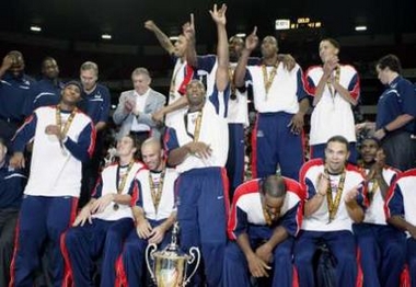 Team USA players celebrate with the championship trophy after defeating Argentina to win the FIBA Americas regional qualifying basketball tournament to decide two berths for the 2008 Beijing Olympics, in Las Vegas, Nevada September 2, 2007. [Reuters] |