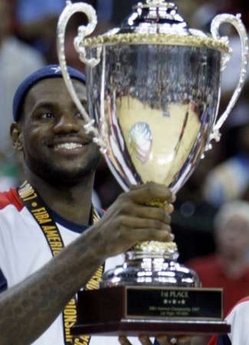 Team USA's LeBron James holds the championship trophy after they defeated Argentina to win the FIBA Americas regional qualifying basketball tournament in Las Vegas, Nevada September 2, 2007. The United States and Argentina clinched berths to the Beijing 2008 Olympics. [Reuters]