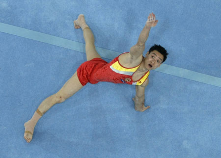 Yang Wei of China competes on the floor during the all-around team competition at the 40th World Artistic Gymnastics Championships in Stuttgart September 3, 2007. Defending China took the lead in front of Japan and Russia with 374.275 points. [Reuters]