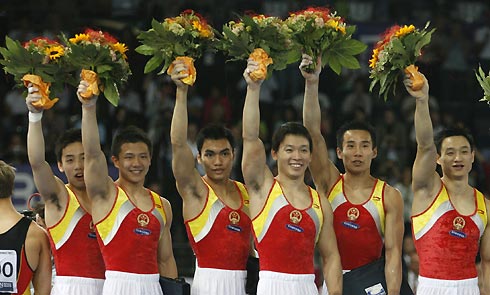 Team China L-R Zou Kai, Chen Ybing, Liang Fuliang, Huang Xu, Xiao Qin and Yang Wei celebrate their gold medal in the team all-around competition at the 40th World Artistic Gymnastics Championships in Stuttgart September 6, 2007. [Reuters]