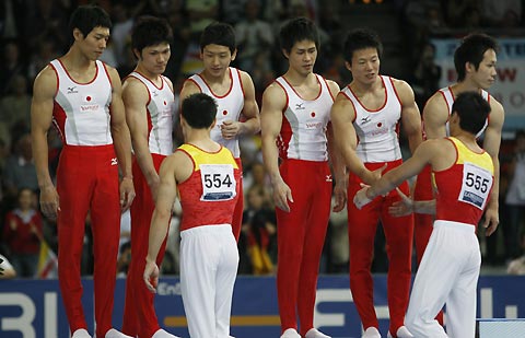 Yang Wei (L) and Xiao Qin (R) of China congratulate the second placed team of Japan in the team all-around competition at the 40th World Artistic Gymnastics Championships in Stuttgart September 6, 2007. [Reuters]