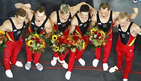 Team Germany celebrates its bronze medal in the all-around competition at the 40th World Artistic Gymnastics Championships in Stuttgart September 6, 2007. [Reuters]