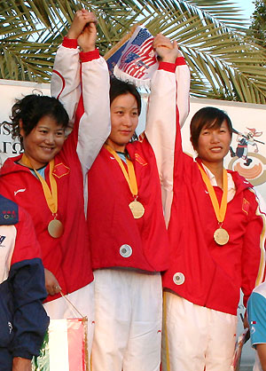 China's Wu Xiumin (C), Wei Ning (R) and Zhang Shan (L) pose with their medals during the prize presentation for the women's skeet shooting at the World Shooting Championships 2007 in Nicosia, Cyprus September 5, 2007. Chinese team wins women's skeet with a new world record of 214 hits, followed by US and Italy. [Xinhua]