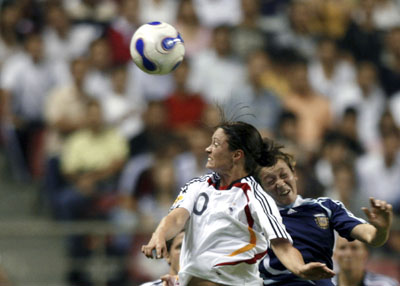 | Germany's Renate Lingor (L) jumps for the ball with Argentina's Valeria Cotelo during their group soccer match of the 2007 FIFA Women's World Cup at the Hongkou Football Stadium in East China's Shanghai, September 10, 2007. Germany wins the opener 11-0. [Reuters] |