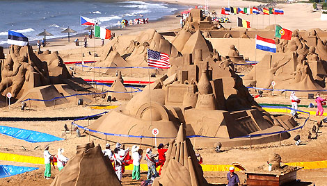 Visitors look at several large Olympic-themed sand creations in East China's Zhejiang Province, September 29, 2007. The sand sculptures were made by 30 artists from 10 countries, including China, the US and Russia, to welcome the 2008 Beijing Olympics as well as illustrate the history of the Games. [Xinhua]