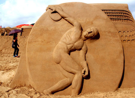A visitor walks past a large sand creation with an ancient Greek Olympic athlete throwing discus, on Zhujiajian Island, East China's Zhejiang Province, September 29, 2007. These and other sand sculptures were made by 30 artists from 10 countries, including China, the US and Russia, to welcome the 2008 Beijing Olympics as well as illustrate the history of the Games. [Xinhua]