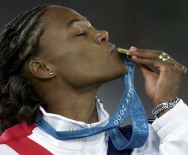 US sprinter Marion Jones kisses the gold medal she won in the women's 100m race at the Olympic Games in Sydney in this September 23, 2000, file photo. Jones has accepted a two-year ban after admitting to the use of a prohibited substance and has relinquished the five Olympic medals she won at the 2000 Sydney Games, the US Anti-Doping Agency (USADA) said on Monday. [Agencies]