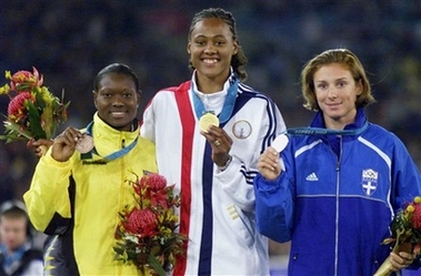 Women's Olympic 100-meters winner Marion Jones of the United States, center, shows off her gold medal with second place finisher Katerina Thanou of Greece, right, and third place finisher Tanya Lawrence of Jamaica, left, in Sydney in this September 23, 2000 file photo. Jones has accepted a two-year ban after admitting to the use of a prohibited substance and has relinquished the five Olympic medals she won at the 2000 Sydney Games, the US Anti-Doping Agency (USADA) said on Monday. [Agencies] |