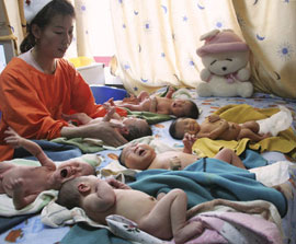 A nurse massages newborn babies inside a children's hospital in Xining, in northwestern China's Qinghai province, in this February 19, 2007 file photo. China is bracing itself for a baby boom. The first generation born under the one-child policy has reached the age of childbearing. And also, a mixture of traditional superstition and new trends has led to an abnormal surge in the population. [Agencies]