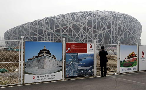 A visitor stands outside the construction site of the National Olympic Stadium, also known as the Bird's Nest, in Beijing October 11, 2007. [Agencies]
