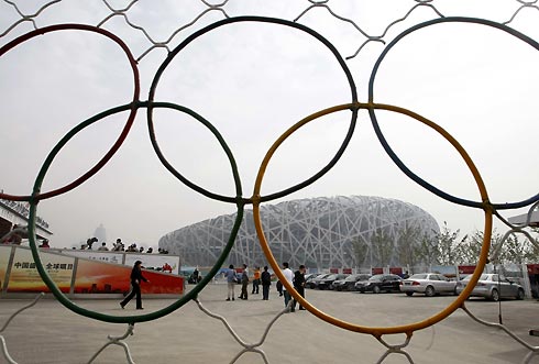A general view shows the National Olympic Stadium, also known as the Bird's Nest, behind an Olympic Rings-shaped fence in Beijing October 11, 2007. [Agencies]