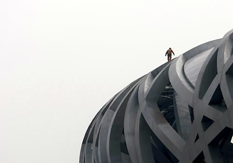 A worker installing an exterior transparent membrane walks on the top of the National Olympic Stadium, also known as the Bird's Nest, in Beijing October 11, 2007. [Agencies]