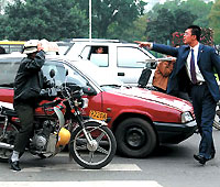 A pedestrian argues with a taxi driver after a near-miss on a busy street. (Liu Nianhai)