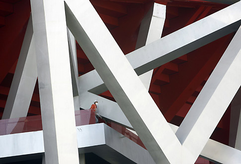 A labourer walks on steel frames inside the construction site of the National Olympic Stadium, also known as the "Bird's Nest", in Beijing November 9, 2007. The main stadium for next year's Beijing Olympic Games, the $400 million "bird's nest", will open to the public for the first time in April to host a test event. [Agencies]