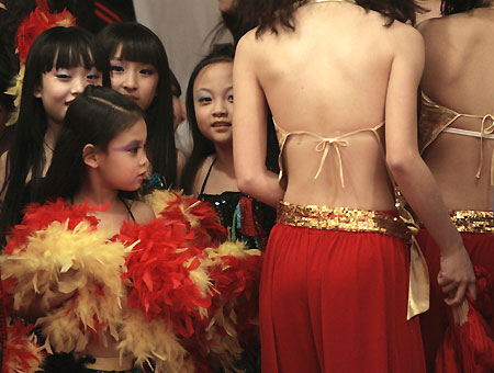 Young cheerleaders look at their competitors during a competition, to select cheerleader groups who will have the chance to perform during the upcoming Olympic Games, in a Beijing shopping mall November 17, 2007. The Beijing Olympics are expected to turn a profit of about $20 million to $30 million, according to a senior Games organiser. [Agencies]
