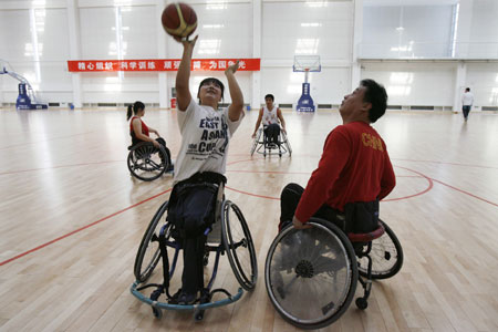 Paralympic basketball players practise at the Beijing Disabled Person's Vocational and Sport Training Center November 21, 2007. China is pushing forward city construction of accessible facilities to help persons with disability and let disabled persons enjoy the fruits of hosting the Olympic Games in Beijing in 2008, organizers said. Beijing is also staging Paralympic Games 2008. [Agencies]