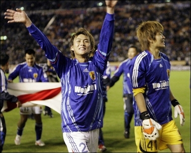Japan's under 22 football players Tadanari Lee (C) and Shusaku Nishikawa wave to supporters after they were qualified to the 2008 Olympic Games, on 21 November, at the Olympic qualifying match against Saudi Arabia in Tokyo. Japan and Saudi Arabia ended the game in a draw 0-0. [Agencies]
