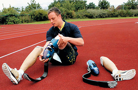 Oscar Pistorius puts on his running shoes at Brunel University in London on July 10. The IAAF is wary of Oscar Pistorius' bid to cross over into mainstream athletics, but he says recent tests will show he has every right to be in Beijing next August. [China Daily/The Olympian]