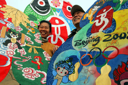 Contestants display their kites with the theme of Beijing 2008 Olympics at the 12th Beijing kite flying contest November 24, 2007. More than 400 participated the contest. [Xinhua]