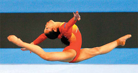 Chinese Cheng Fei performs on the floor during the women's qualifications of the 40th World Gymnastics Championships on Saturday. [Agencies]