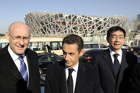 French President Nicolas Sarkozy (C) visits China's National Stadium with French Junior Minister for Sports Bernard Laporte (L) during the last day of his visit to China November 27, 2007. Sarkozy said he had accepted an invitation by China's President Hu Jintao to come to the Olympic Games in Beijing next August. [Agencies]