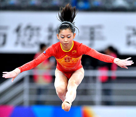 Teenager Jiang Yuyuan of China performs her routine on the balance beam during the "Good Luck Beijing" Olympic gymnastics test in the newly-built National Indoor Stadium, Nov. 29, 2007. Jiang scored 61.225 points to lead all four apparatuses in the women's all-around, followed by runner-up Daria Joura from Australia and bronze medalist Bridget Sloan of America. [Xinhua]