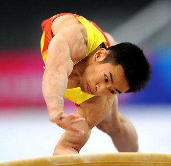 Lu Bin of China performs his routine on the vault at the 2007 Gymnastics International Invitational Tournament, a test event for the 2008 Olympic Games. Lu snatched four golds in the test. [Xinhua] |