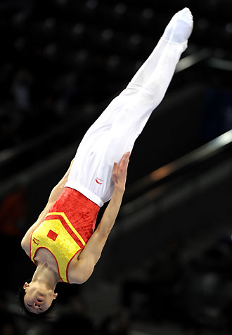 Ye Shuai of China competes in men's trampoline during the 2007 Good Luck Beijing Olympic test games at the National Indoor Stadium in Beijing on December 3, 2007. Ye won the gold. [Xinhua]